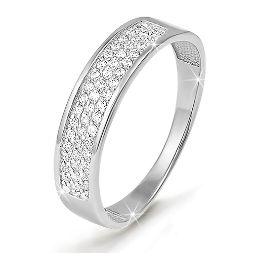 Кольцо выполнено из благородного белого золота, создающего изысканный и элегантный облик. Центральный элемент украшения — широкая дорожка из сверкающих фианитов. Камни переливаются всеми цветами спектра, добавляя изделию роскоши и шарма. Это кольцо станет прекрасным дополнением как к повседневному образу, так и к праздничному наряду.