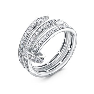 Стильное кольцо выполнено из белого золота 585 пробы и украшено фианитами. Оригинальный дизайн, повторяющий форму гвоздя, дополнен прозрачными фианитами круглой огранки. Кольцо в символичном стиле, украшенное камнями, покорит любительниц трендовых стильных украшений. Приобретайте кольцо выгодно в магазинах Мир Золота.