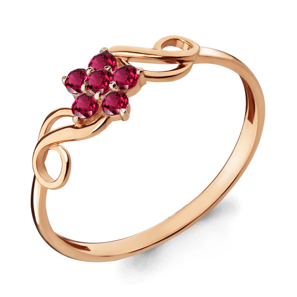 Изящное кольцо из красного золота 585 пробы с очаровательным декором из ярких рубиновых корундов очень красиво и утонченно смотрится на руке. Украшение дополнит женственный образ изысканным блеском и ярким акцентом камней, и эффектно подчеркнет красоту и очарование владелицы. Приобретайте ювелирное кольцо выгодно в магазинах Мир Золота.