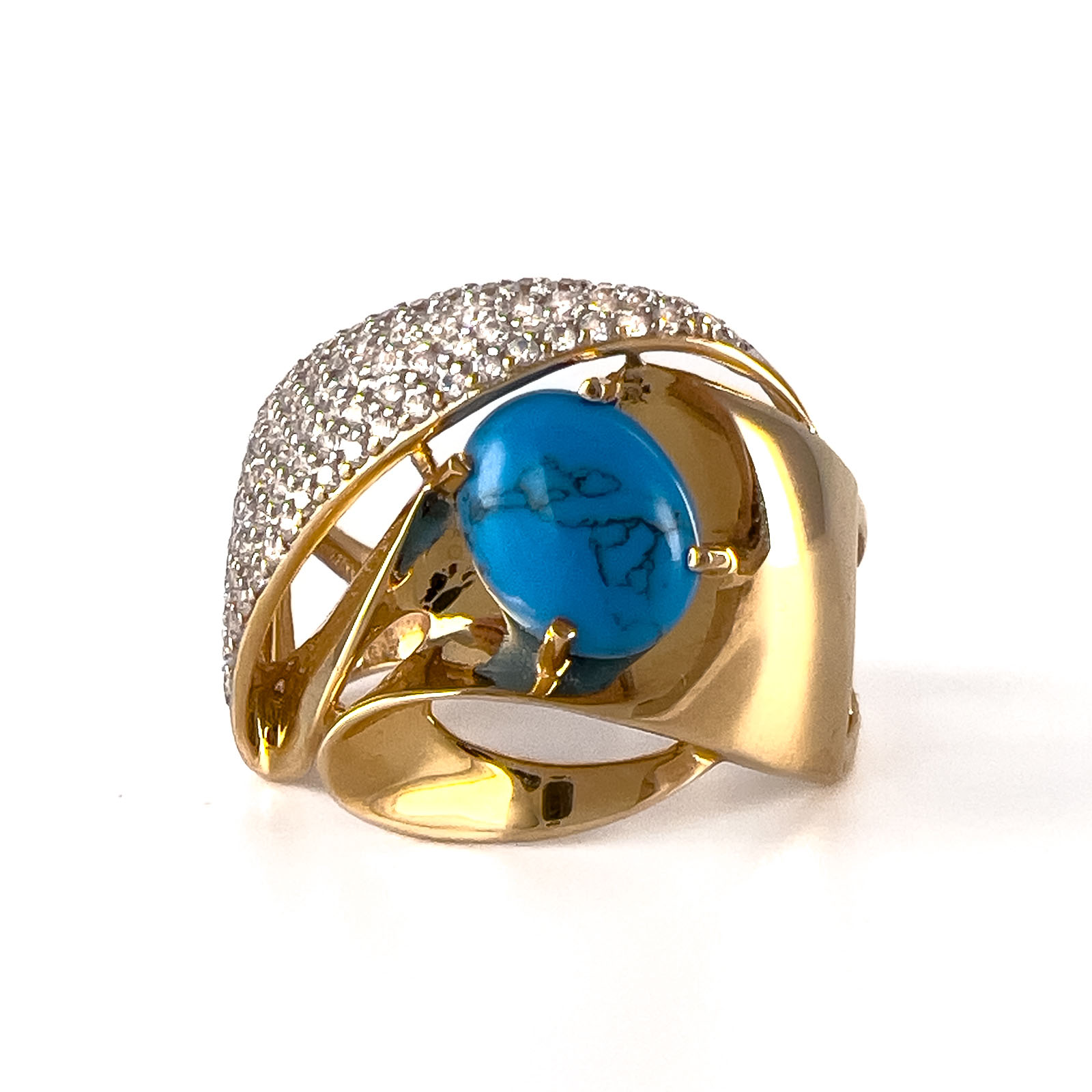 Кольцо из красного золота с бирюзой и сияющими фианитами придется по вкусу стильным женщинам, которые привыкли выбирать для себя только лучшее. Футуристичный дизайн украшения задает динамику и подчеркивает природную роскошь камней. Покупайте золотые украшения исключительного качества по привлекательной цене в магазинах Мир Золота.