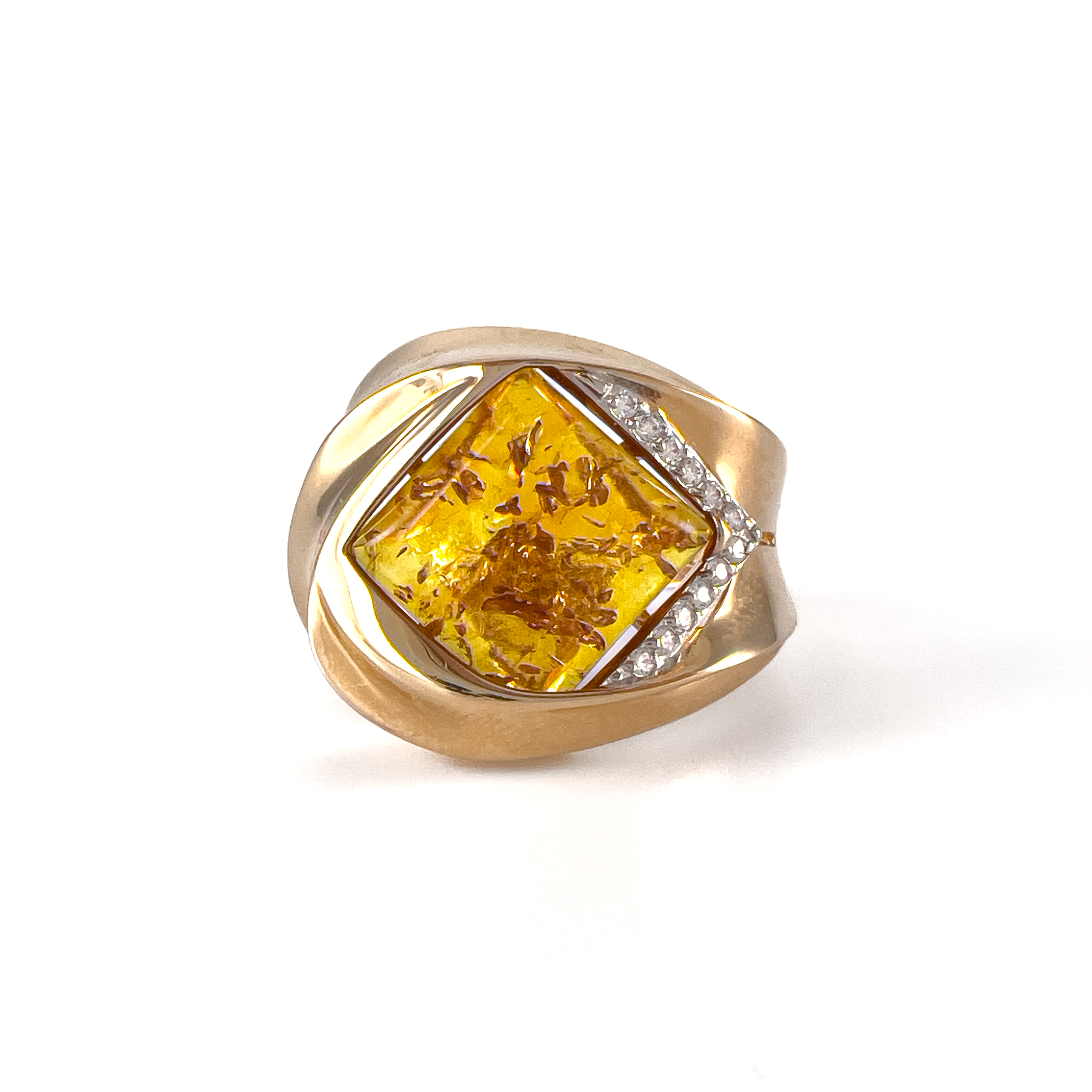 Золотое кольцо с натуральным янтарем выглядит стильно и роскошно. Теплый оттенок камня невероятно эффектно сочетается с красным золотом высшей пробы, создавая красивое сияние. Солнечный янтарь способен притягивать счастье и удачу, избавлять от тревоги, развивать интуицию. Купите интересное украшение с янтарем в ювелирных магазинах Мир Золота.