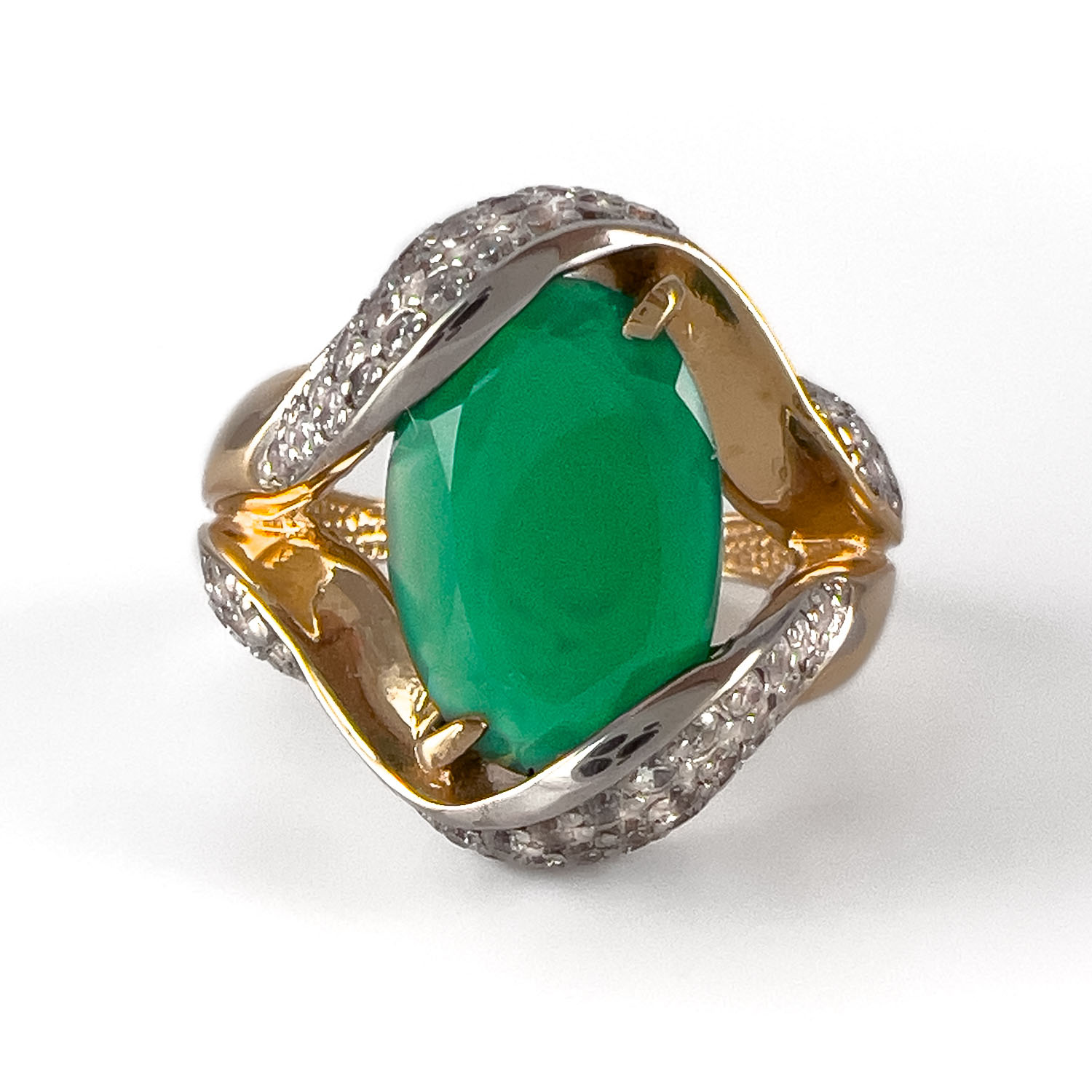 Объемное женское кольцо из красного золота 585 пробы с насыщенным зеленым агатом станет идеальным продолжением вечернего образа. Оригинальное паве из фианитов выглядит современно и интересно, добавляя украшению блеск и сияние. Купите золотое кольцо с агатом и фианитами в ювелирных магазинах Мир Золота.