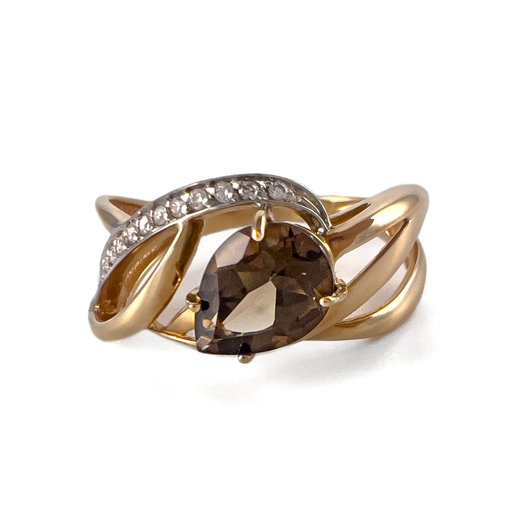 Восхитительное кольцо выполнено в изящном дизайне из красного золота 585 робы с раухтопазом каплевидной огранки "Груша" и дорожкой прозрачных фианитов. Украшение отлично смотрится на руке и подчеркивает изысканность женственного образа. Приобретайте привлекательное кольцо по выгодным ценам в магазинах Мир Золота.