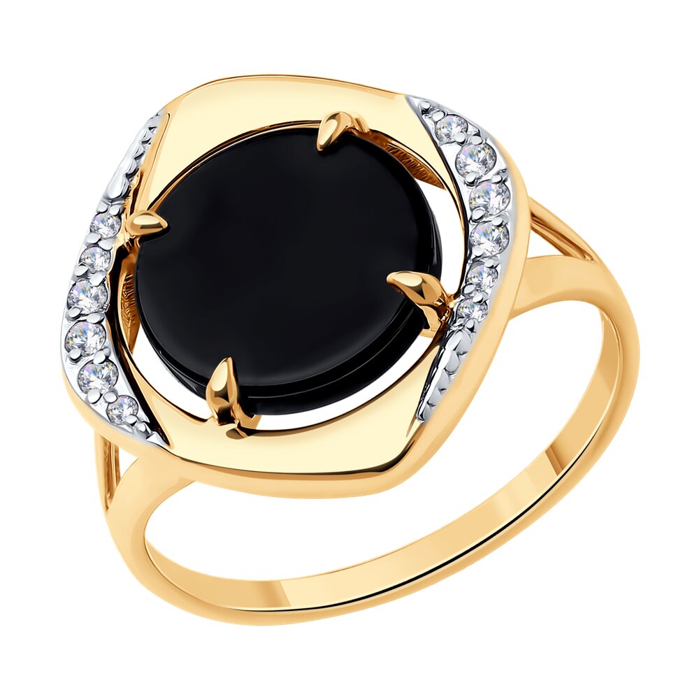 Эффектное золотое кольцо с черным агатом и фианитами заметно преобразит женский облик, добавив ему особого блеска и элегантности. Стильное кольцо современного дизайна роскошно смотрится, и отлично подойдет к классическому или вечернему образу, выгодно подчеркнув индивидуальность и безупречность стиля владелицы. Приобретайте ювелирное украшение по выгодным ценам в магазинах Мир Золота.