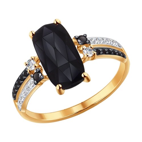 Оригинальное кольцо выполнено из красного золота в интересном дизайне, украшено черным агатом и фианитами. Кольцо привлекает внимание эффектным сочетанием загадочного черного агата с контрастным блеском прозрачных и черных фианитов, образующих стильную композицию. Приобретайте ювелирное украшение для прекрасного подарка по выгодным ценам в магазинах Мир Золота.