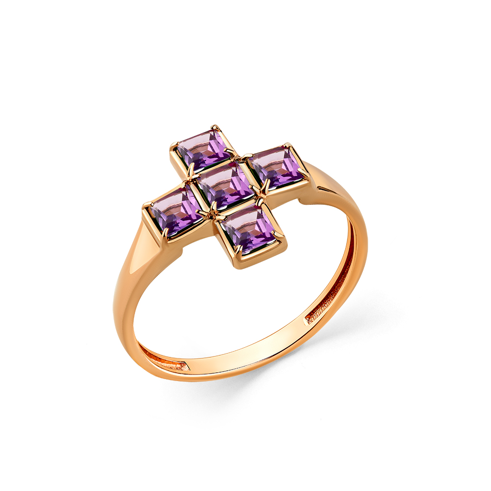 Оригинальное кольцо с аметистами выполнено из красного золота высшей пробы. Выразительный декор украшения составляют декоративные вставки из пяти ярких аметистов квадратной формы, оформленные в виде креста. Стильное украшение отлично подчеркнет яркий современный образ обладательницы. Приобретайте ювелирное украшение выгодно в магазинах Мир Золота.