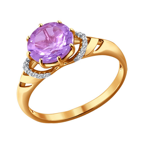 Кольцо привлекательного дизайна выполнено из красного золота 585 пробы и украшено аметистом и фианитами. Чувственный аметист в окружении теплого блеска золота и мерцающего сияния прозрачных фианитов превращают ювелирное украшение в незаменимую деталь неповторимого женственного образа. Приобретайте украшение по выгодной цене в магазинах Мир Золота.