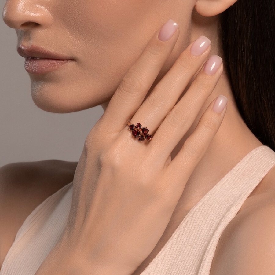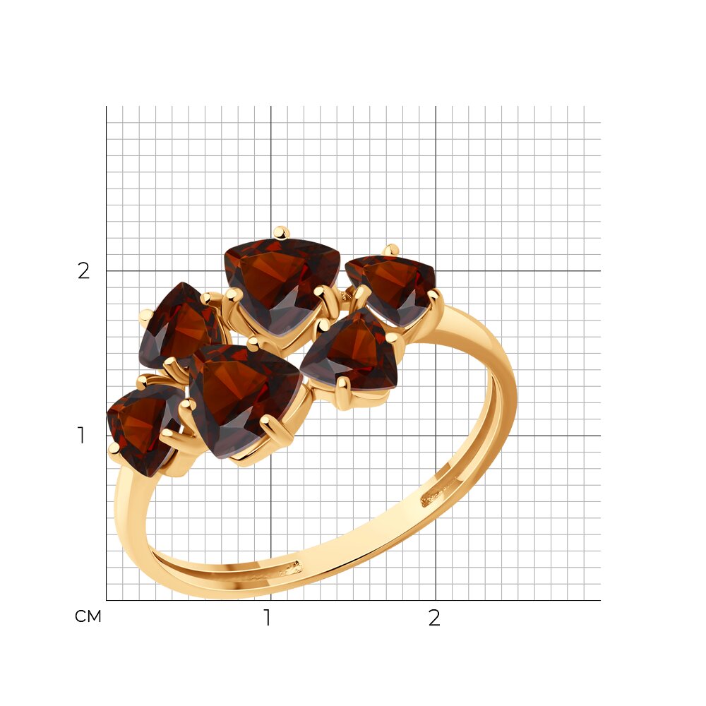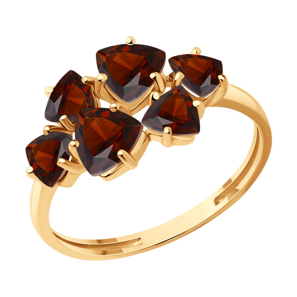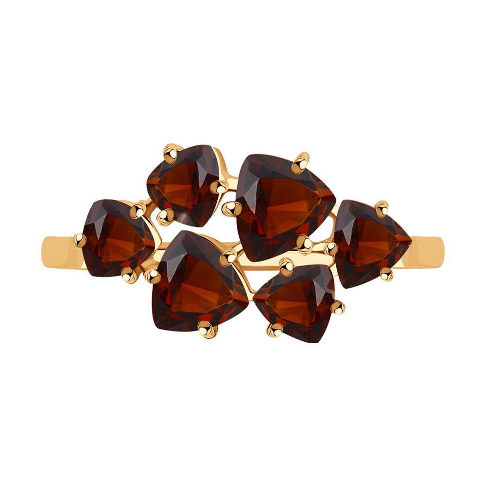 Привлекательное кольцо с миксом камней натурального граната выполнено из красного золота 585 пробы. Фигурная огранка Триллион необычно смотрится, и раскрывает яркий блеск и насыщенный цвет камней. Выразительный образ украшения несомненно привлечет внимание окружающих. Приобретайте ювелирное украшение по выгодной цене в магазинах Мир Золота.