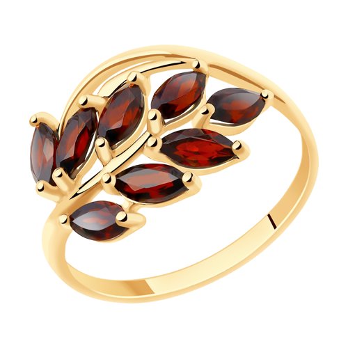 Восхитительное кольцо выполнено в изумительном дизайне из красного золота 585 пробы с прекрасными гранатами. Яркий декор в виде изящной веточки с сияющими гранатами очень красиво и изящно смотрится, и не останется незамеченным. Кольцо эффектно дополнит вечерние и коктейльные образы. Приобретайте украшение в подарок по выгодным ценам в магазинах Мир Золота.