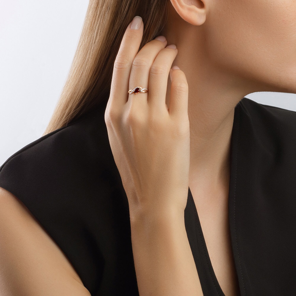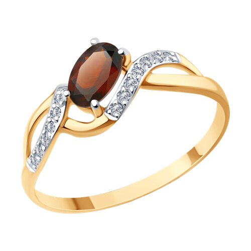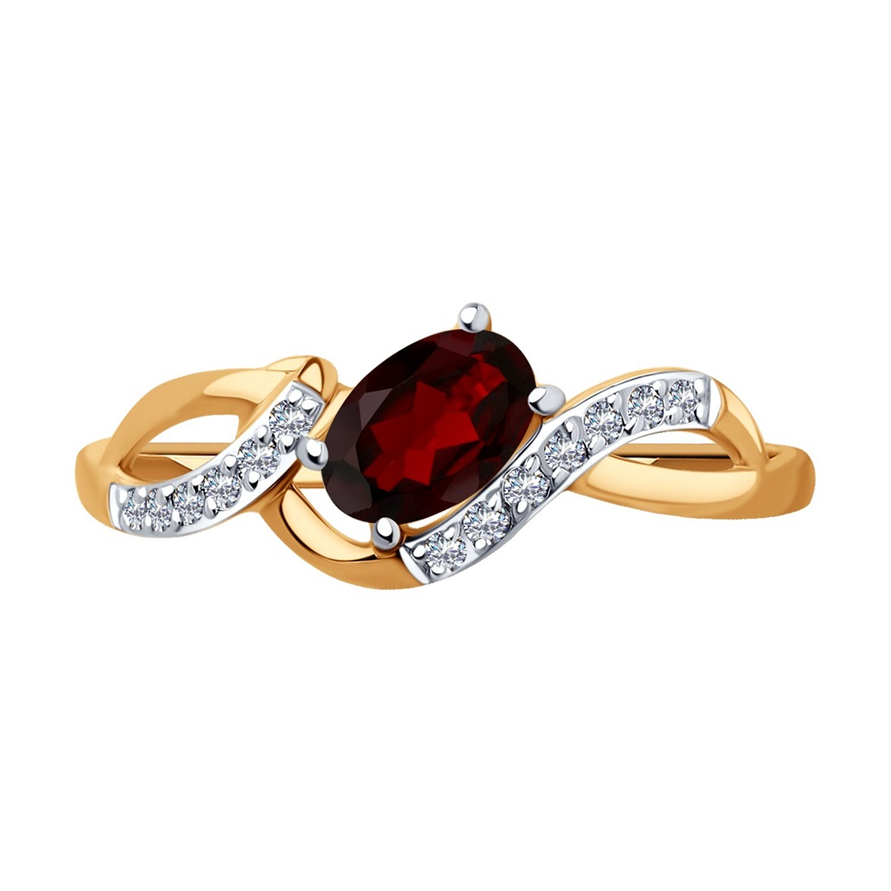 Изящное кольцо с гранатом и фигурными дорожками из фианитов выполнено из красного золота 585 пробы в привлекательном дизайне. Очень женственное украшение очаровательно и аккуратно смотрится на руке, яркий гранат в сочетании с прозрачным блеском фианитов раскрывает свой насыщенный глубокий цвет. Приобретайте ювелирное украшение по выгодной цене в магазинах Мир Золота.