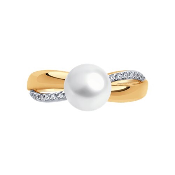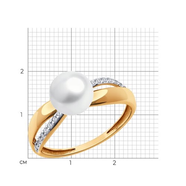 Кольцо с натуральным белым жемчугом и искристыми дорожками фианитов выполнено из красного золота 585 пробы. Украшение очень красиво и изящно смотрится, мерцающий блеск фианитов придает изделию более нарядный вид и выигрышно подчеркивает нежный цвет жемчуга. Приобретайте ювелирное украшение по выгодной цене в магазинах Мир Золота.