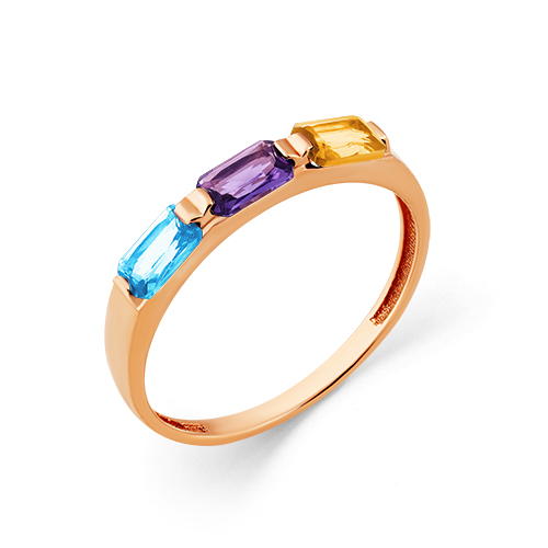 Утонченное легкое кольцо из красного золота 585 пробы с яркими полудрагоценными вставками с топазом, аметистом и цитрином. Стильное украшение с разноцветным блеском ювелирных камней станет изящным акцентом повседневных современных образов, и подчеркнет очарование и женственность владелицы. Покупайте кольцо для себя или в подарок по выгодной цене в магазинах Мир Золота.