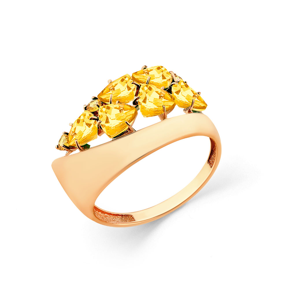 Привлекательное кольцо с цитринами, из красного золота 585 пробы, приковывает внимание своим необычным дизайном и золотистым блеском камней. Цитрины эффектной формы огранки в сочетании с мягким драгоценным металлом смотрятся ярко и притягательно, украшение дополнит женственный образ особым шармом и теплым сиянием. Приобретайте ювелирное кольцо по выгодной цене в магазинах Мир Золота.