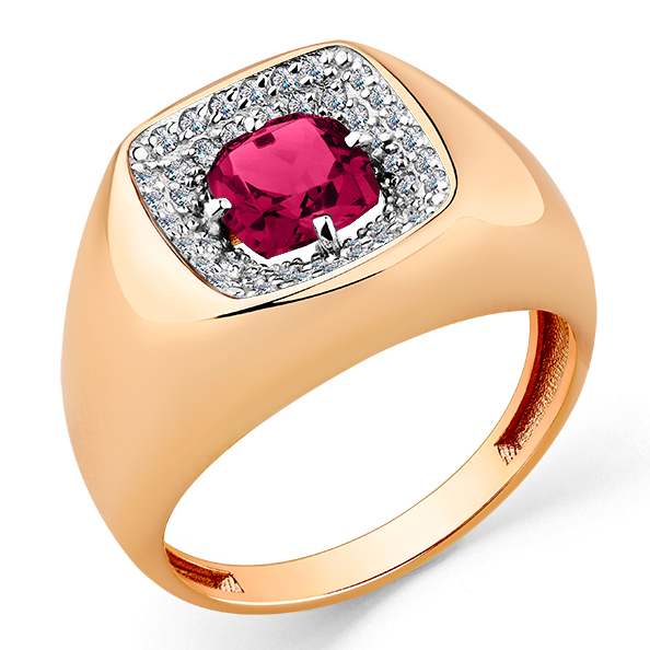 Широкое кольцо из красного золота 585 пробы с рубиновым корундом в окружении паве из прозрачных фианитов. Яркий корунд эффектно смотрится на фоне сияющих камней, благородный блеск драгоценного металла дополняет элегантный и роскошный образ украшения. Кольцо идеально подойдет для особых событий, и будет прекрасным подарком для женщины. Приобретайте ювелирное украшение выгодно в магазинах Мир Золота.