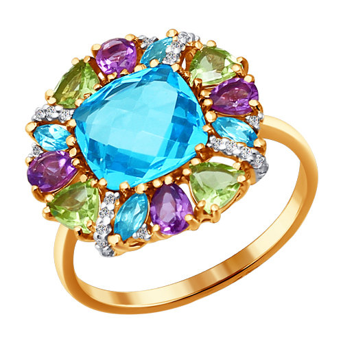 Кольцо из красного золота 585 пробы с эффектным декором из аметистов, топазов, хризолитов и фианитов привлекает внимание ярким блеском разноцветных камней. Украшение добавит женскому образу шарма и очарования, и станет выразительной деталью любого наряда. Приобретайте ювелирное украшение для себя или в подарок по выгодным ценам в магазинах Мир Золота.