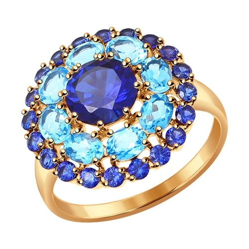 Эффектное кольцо из красного золота 585 пробы, декорированное завораживающей композицией из синтетических корундов и топазов. Изысканное сочетание благородного золота с голубыми и синими камнями приковывает взгляд, притягательное украшение смотрится ярко и нарядно, и станет главным акцентом вечернего и коктейльного образа. Приобретайте кольцо в подарок по выгодной цене в магазинах Мир Золота.