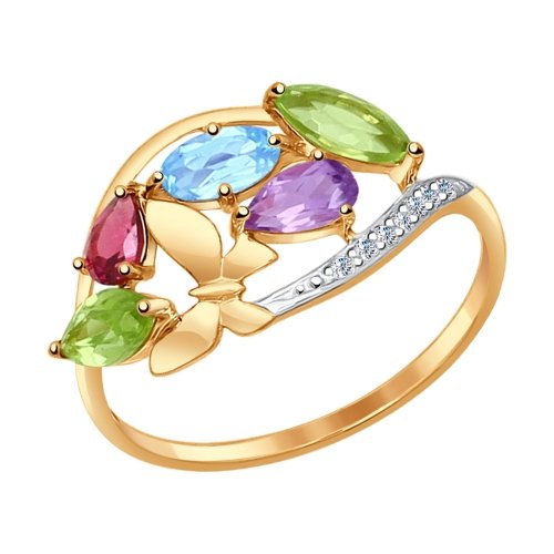 Изящное легкое кольцо интересного дизайна с ярким миксом разноцветных камней выполнено из красного золота 585 пробы. Очаровательный декор с аметистом, родолитом, топазом, хризолитами и прозрачными фианитами дополнен миниатюрной золотой бабочкой. Изящное украшение очень женственно выглядит и создает романтичное настроение. Покупайте кольцо в подарок по выгодной цене в магазинах Мир Золота.