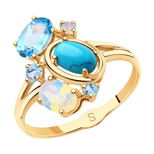 Изумительное кольцо в оригинальном ювелирном исполнении из красного золота с миксом камней ситалла, топаза и бирюзы. Восхитительное сочетание подобранных камней голубых оттенков и благородного золота никого не оставит равнодушным, нежное и очаровательное сияние приковывает взгляд. Особенно эффектно кольцо будет смотреться в комплекте с серьгами. Приобретайте необычное украшение выгодно в магазинах Мир Золота.