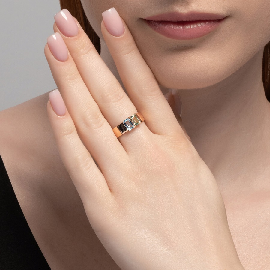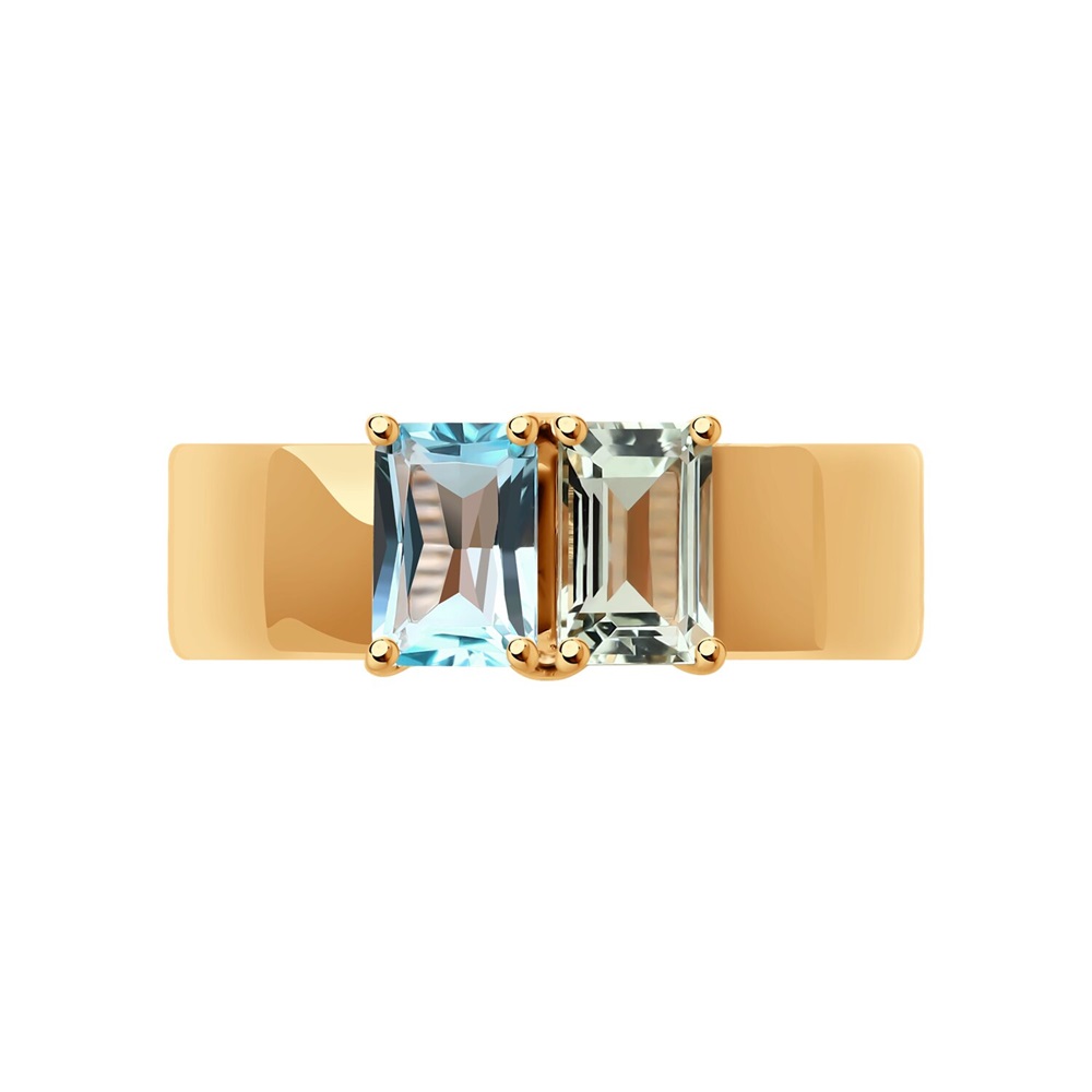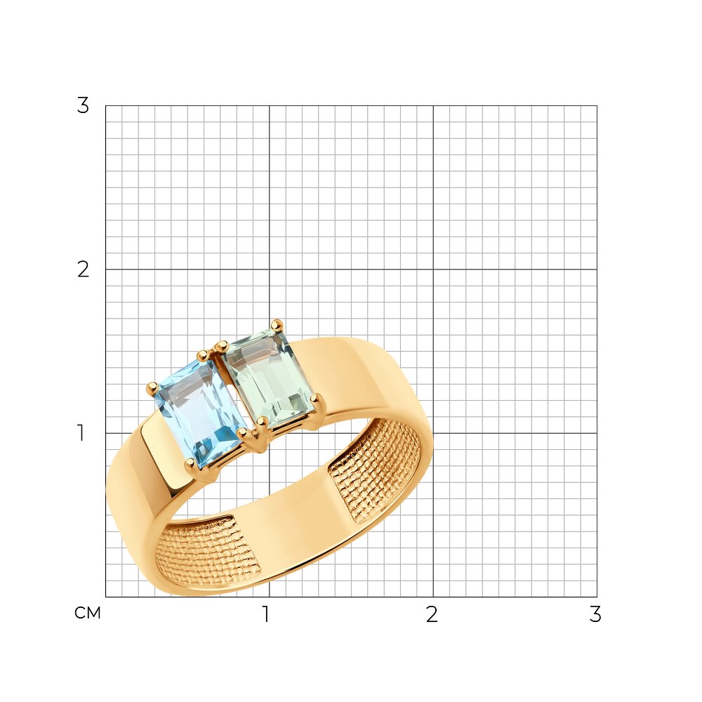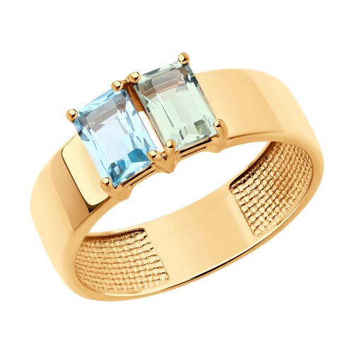 Кольцо из красного золота 585 пробы с празиолитом и голубым топазом выполнено из красного золота 585 пробы. Стильное украшение с прозрачным сиянием полудрагоценных камней смотрится женственно и привлекательно, и станет универсальным аксессуаром для повседневного делового или элегантного вечернего наряда. Приобретайте кольцо по выгодной цене в магазинах Мир Золота.