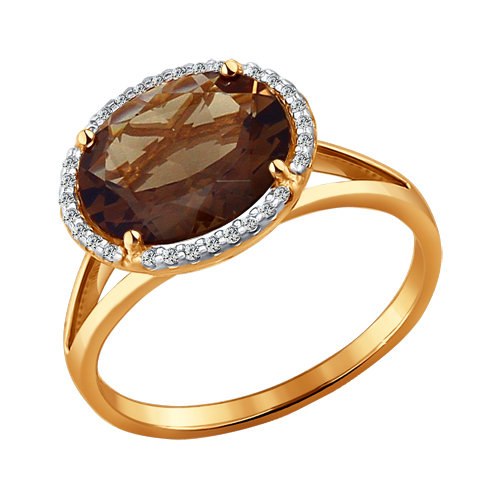 Элегантное кольцо из красного золота 585 пробы декорировано удивительным раухтопазом в окружении кристальных фианитов. Классическое украшение с завораживающим блеском камней превосходно смотрится на руке, и станет великолепным дополнением неотразимого женственного образа. Приобретайте ювелирное кольцо в подарок по выгодной цене в магазинах Мир Золота.