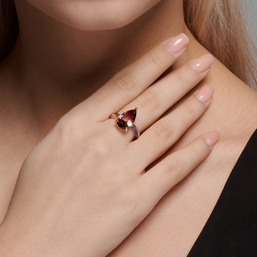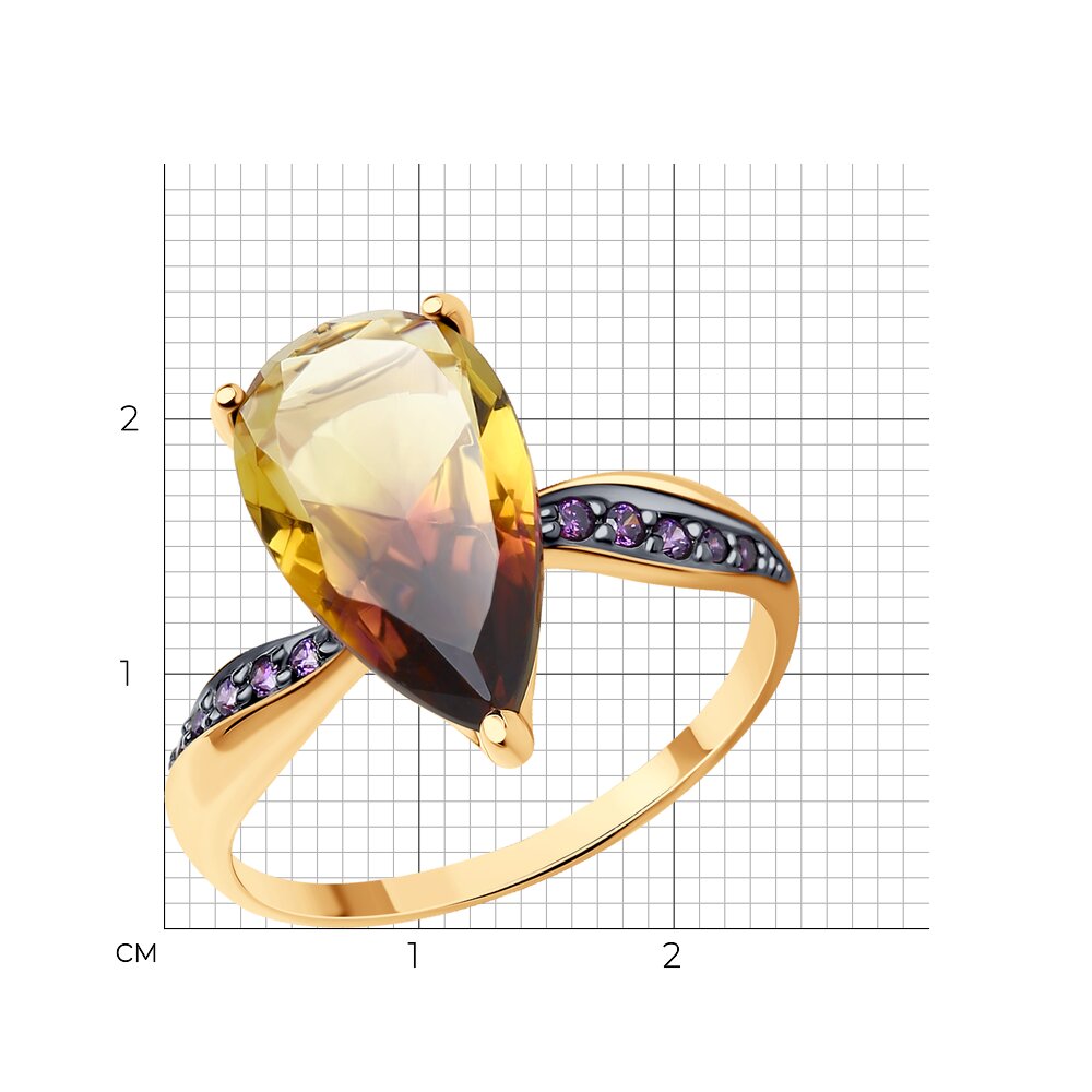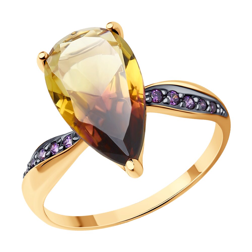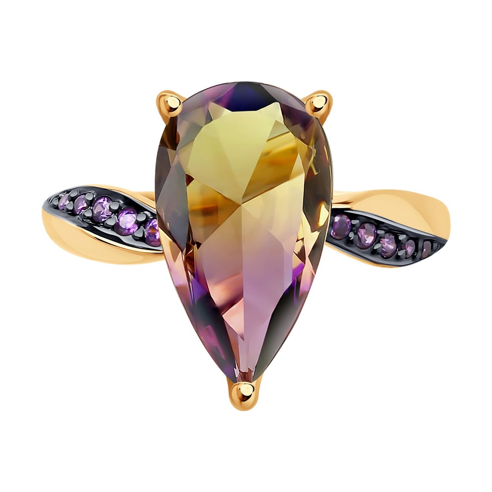 Кольцо с переливчатым сиянием ситалла цвета аметрин и изящными дорожками с цветными фианитами, из красного золота 585 пробы, эффектно дополнит элегантный женский образ. Превосходный ситалл удивительного оттенка грушевидной формы огранки, подчеркнутый сиреневыми фианитами, смотрится особенно выигрышно в своем объеме и изысканном сиянии. Покупайте ювелирное украшение выгодно в магазинах Мир Золота.