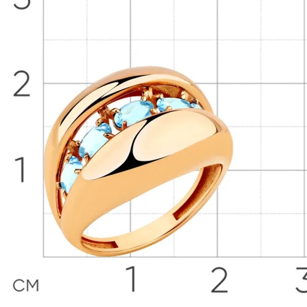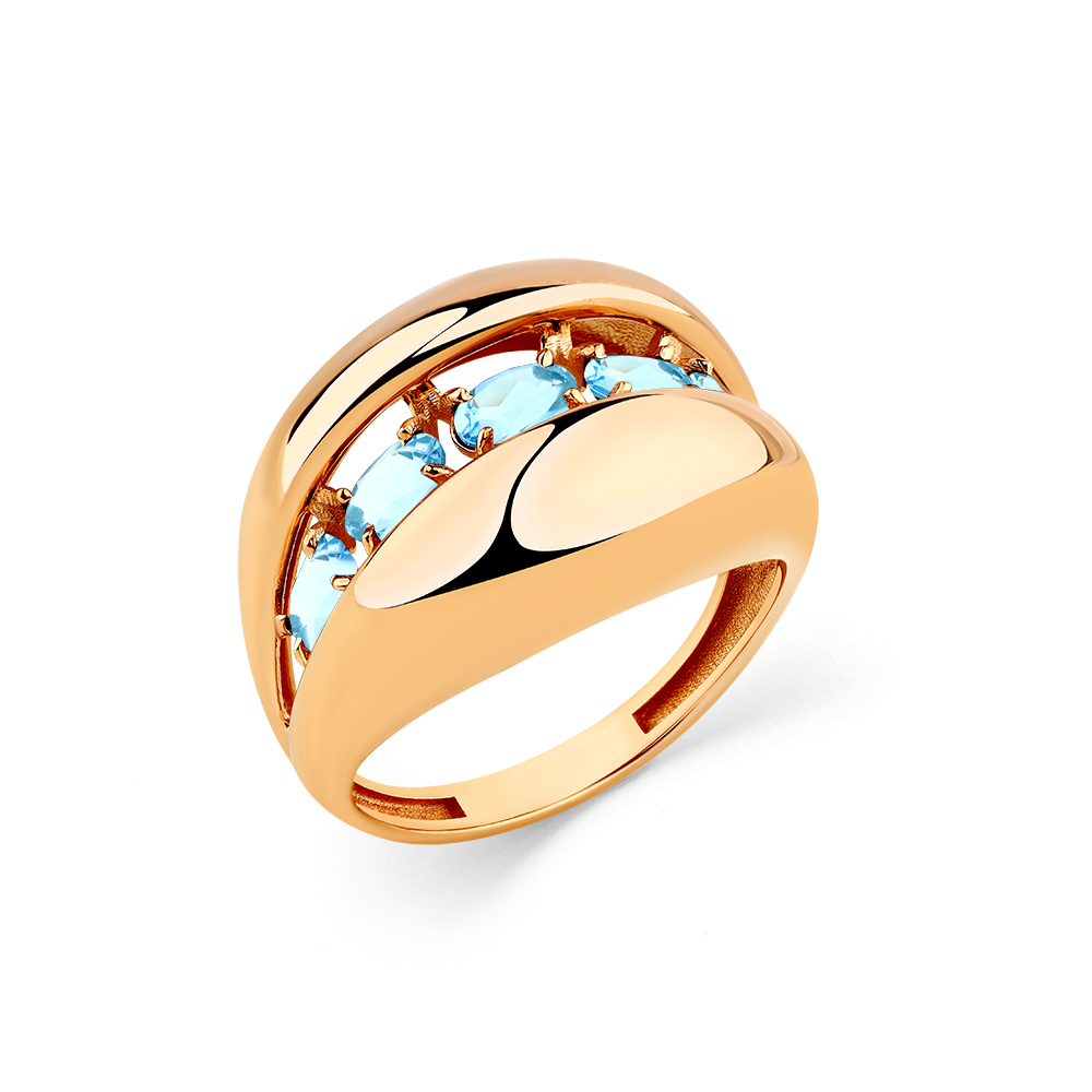 Кольцо необычного ювелирного дизайна из красного золота 585 пробы декорировано голубыми топазами. Нежный блеск полудрагоценных камней в объятиях мягкого сияния благородного золота обращает на себя внимание, украшение заметно разнообразит женский образ, подчеркнув очарование и элегантность владелицы. Приобретайте ювелирное украшение по выгодным ценам в магазинах Мир Золота.