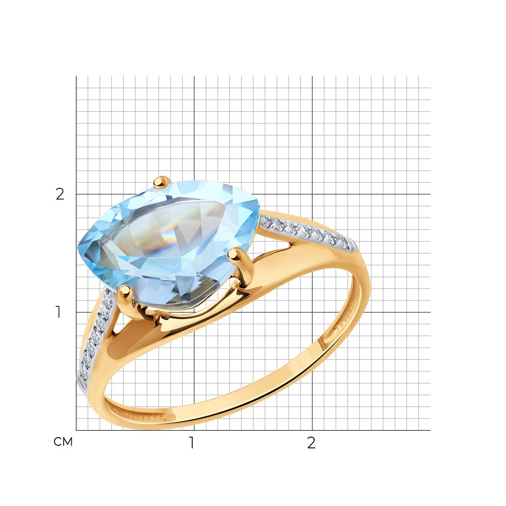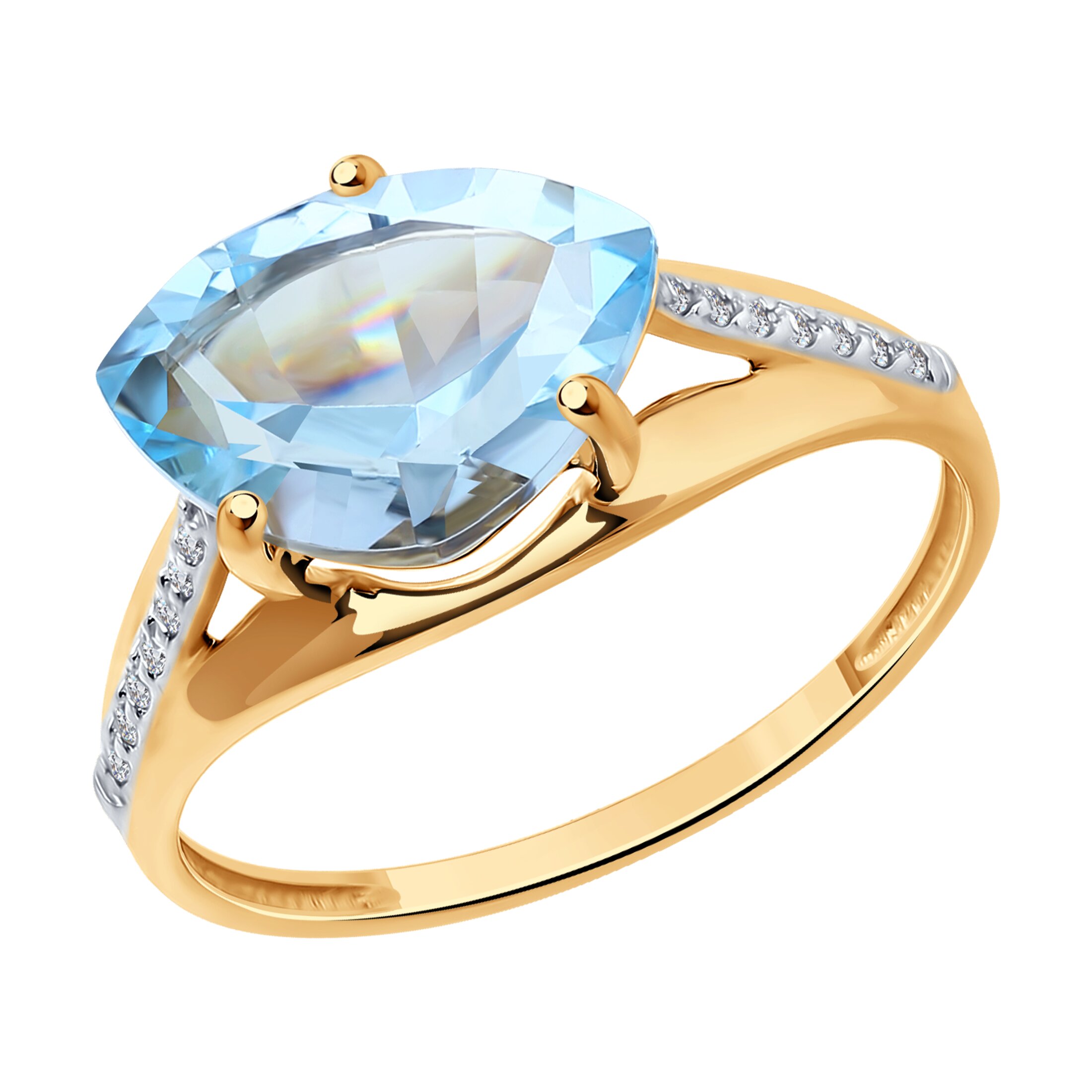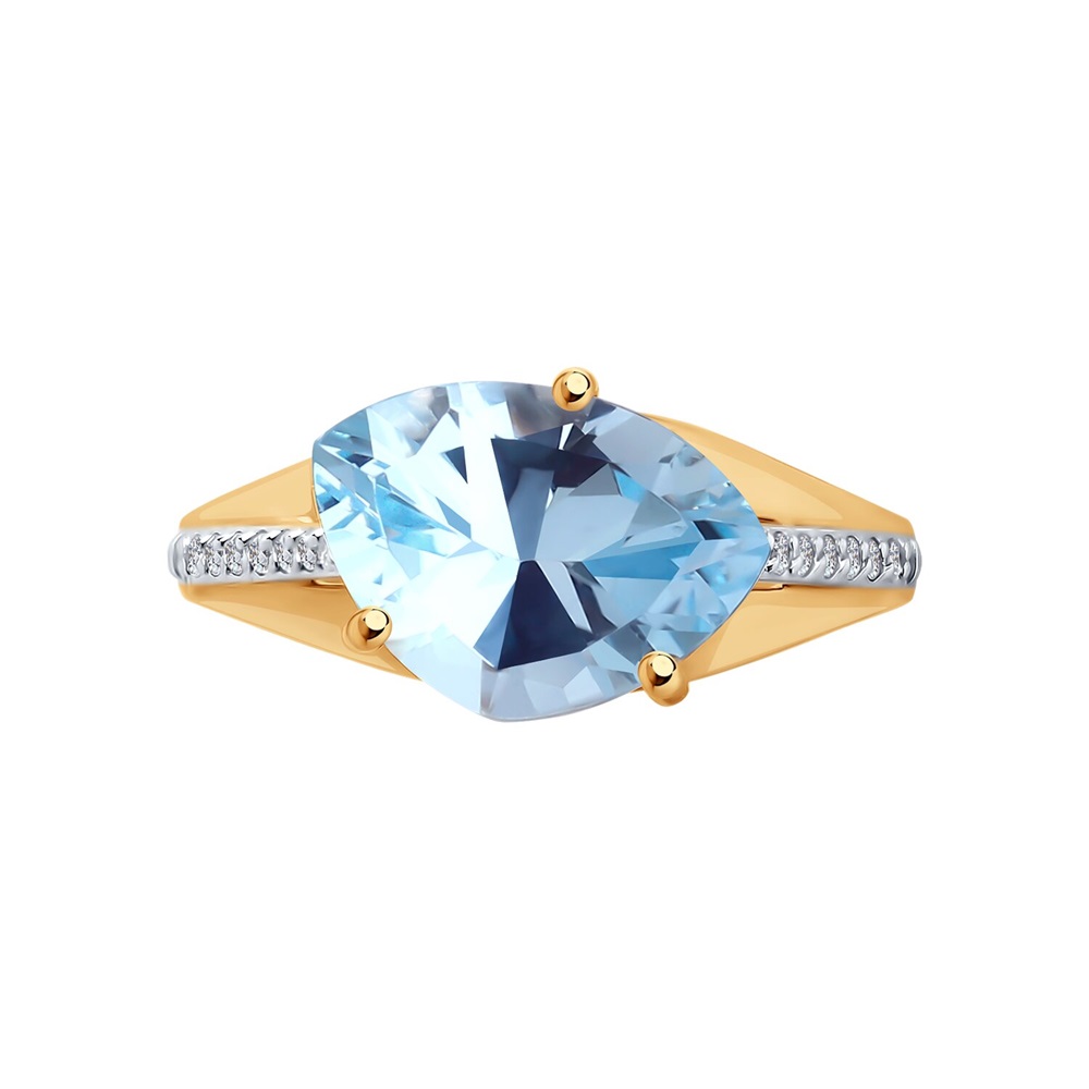 Восхитительное кольцо выполнено из красного золота 585 пробы с голубым топазом и дорожками с прозрачными фианитами. Великолепный топаз необычной формы огранки приковывает взгляд, эффектная закрепка выгодно подчеркивает его нежное переливчатое сияние и неотразимую красоту. Яркое кольцо станет безупречным завершением женственного образа. Приобретайте украшение в подарок выгодно в магазинах Мир Золота.