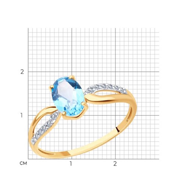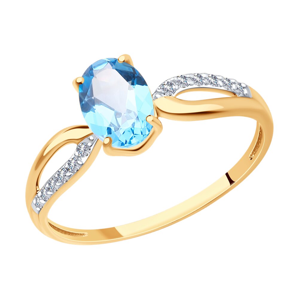 Женское кольцо с голубым топазом и дорожками из фианитов выполнено из красного золота 585 пробы в привлекательном дизайне. Нежный лазурный топаз в сочетании с прозрачным блеском фианитов эффектно смотрится, красиво переливаясь на свету, и станет очаровательным акцентом женственного образа. Приобретайте ювелирное украшение по выгодной цене в магазинах Мир Золота.