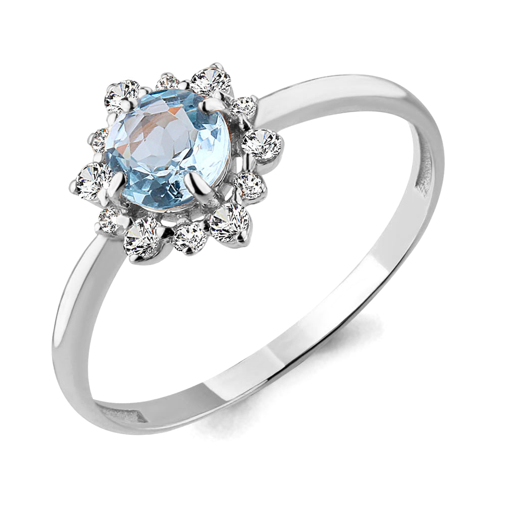 Утонченное кольцо из белого золота 585 пробы с топазом sky blue и кристальными фианитами. Кольцо с изысканным декором из завораживающего топаза нежно-голубого оттенка в кристальном кружеве из искристых фианитов эффектно смотрится и притягивает взгляд. Стильное украшение будет идеальным подарком и очаровательным акцентом женского образа. Покупайте ювелирное украшение выгодно в магазинах Мир Золота.