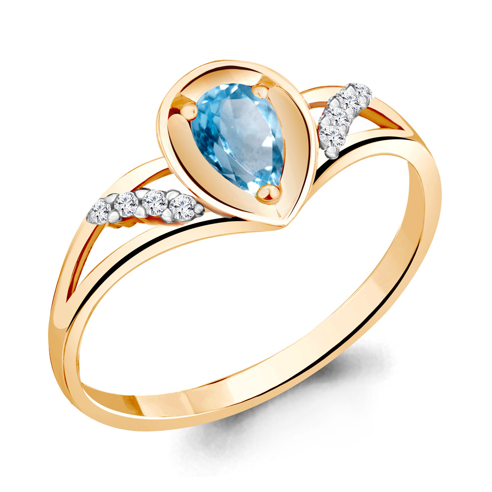 Привлекательное кольцо изящного ювелирного дизайна с голубым топазом swiss и кристальными фианитами выполнено из красного золота 585 пробы. Украшение с изумительным блеском камней идеально подчеркнет утонченный женский образ, добавив ему больше шарма и очарования. Приобретайте ювелирное кольцо в подарок выгодно в магазинах Мир Золота.