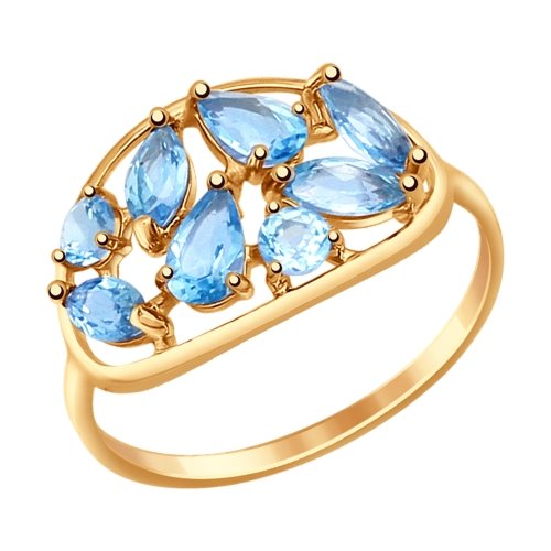 Кольцо из красного золота 585 пробы с миксом натуральных голубых топазов утонченной формы огранки не оставит женщину равнодушной. Нежная композиция из прозрачно-голубых топазов в гармоничном сочетании с мягким блеском золота сделает женский образ более изысканным и привлекательным. Украшение будет идеальным подарком, подчеркивающим красоту и женственность владелицы. Приобретайте кольцо по выгодной цене в магазинах Мир Золота.