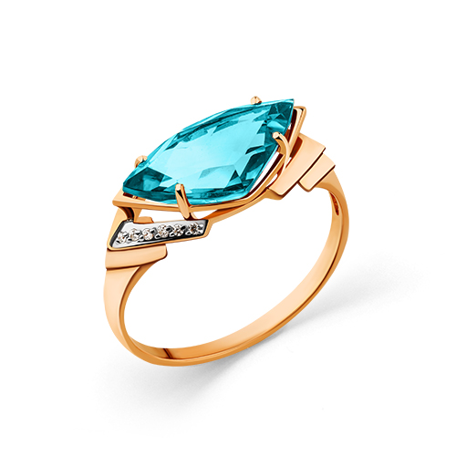 Кольцо из красного золота 585 пробы декорировано фианитами и голубым топазом ситаллом необычной формы огранки. Яркий необыкновенный топаз swiss в сочетании с роскошным блеском золота и вставками с искристыми фианитами завораживает взгляд, украшение станет эффектным дополнением стильного современного образа. Приобретайте ювелирное украшение по выгодным ценам в магазинах Мир Золота.