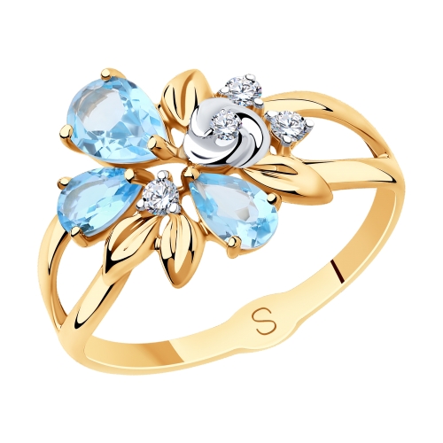 Восхитительное кольцо необыкновенного дизайна из красного золота 585 пробы, декорировано очаровательной композицией из голубых топазов и сверкающих фианитов. Кольцо с изящным декором с нежными топазами и кристальным блеском фианитов завораживает взгляд, и станет великолепной деталью неповторимого женственного образа. Покупайте украшение для своей коллекции или в подарок выгодно в магазинах Мир Золота.