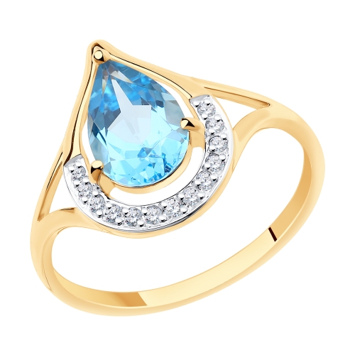 Кольцо выполнено из красного золота 585 пробы с голубым топазом swiss и сверкающими фианитами. Яркий топаз насыщенного оттенка окутан искристым сиянием кристальных фианитов и мягким блеском драгоценного металла. Украшение подчеркнет женственность владелицы, и станет выразительной деталью элегантного образа. Приобретайте ювелирное украшение по выгодным ценам в магазинах Мир Золота.