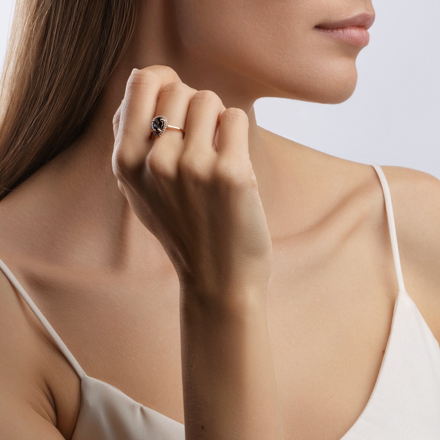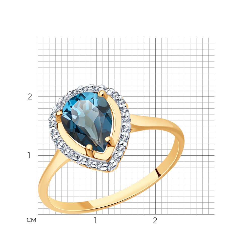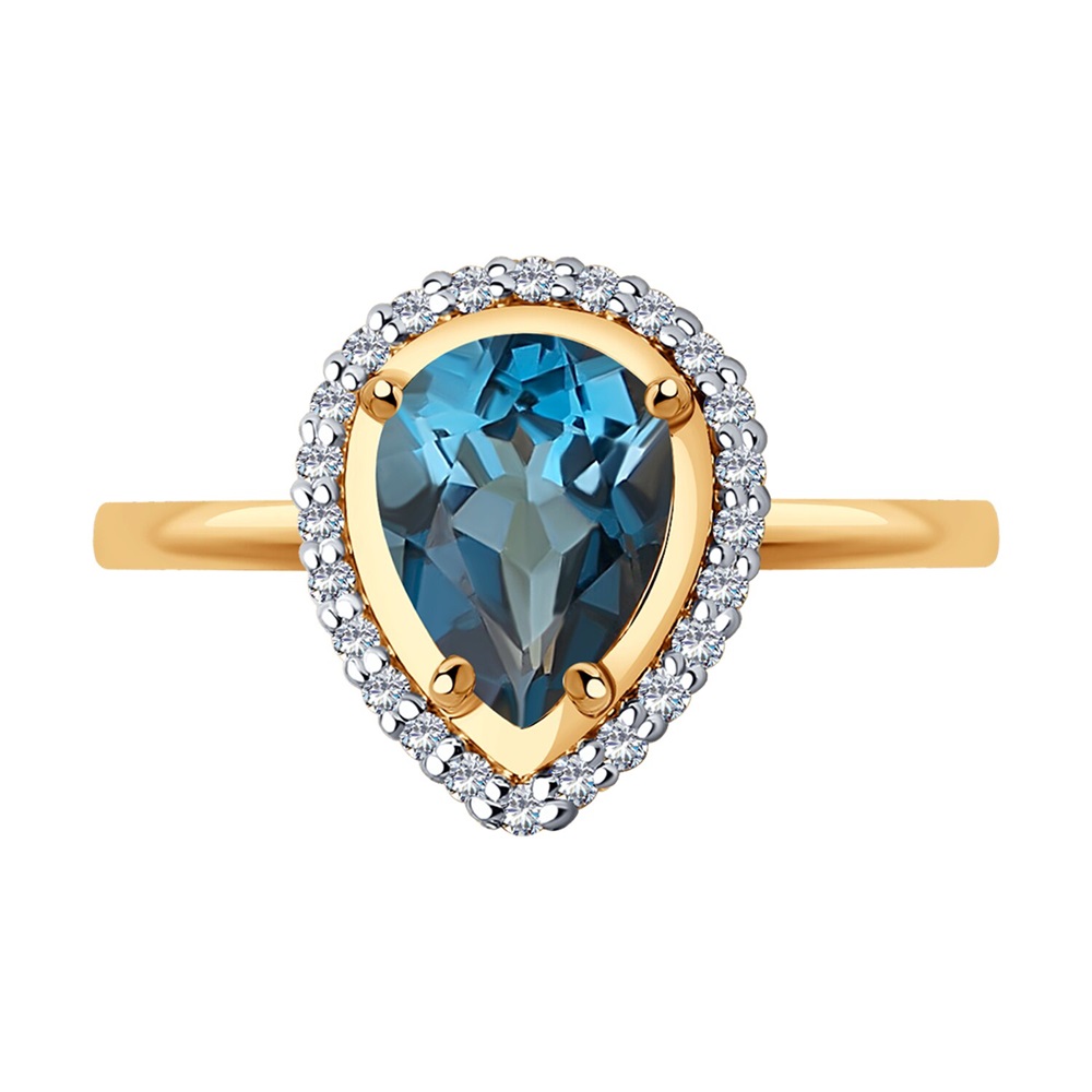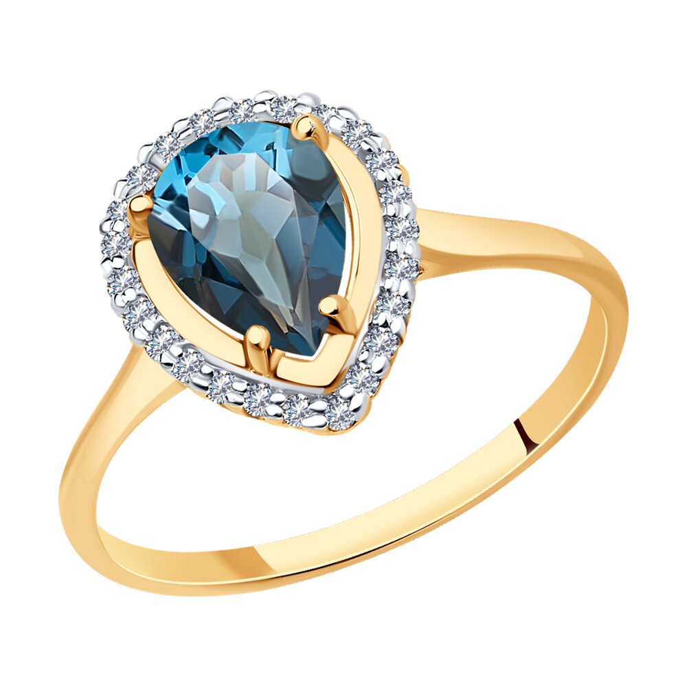 Кольцо выполнено из красного золота 585 пробы с привлекательным топазом лондон, подчеркнутым сверкающими фианитами. Превосходный топаз грушевидной формы огранки в кристальном сиянии фианитов красиво играет на свету и привлекает внимание. Кольцо идеально украсит элегантный женственный образ владелицы, добавив ему яркого блеска и особого очарования. Приобретайте украшение по выгодным ценам в магазинах Мир Золота.