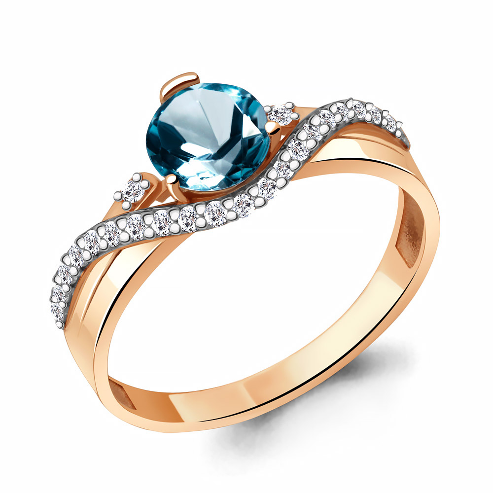Кольцо привлекательного дизайна выполнено из красного золота 585 пробы с лондон топазом и изящными вставками с кристальными фианитами. Яркое украшение с завораживающим сиянием камней добавит женскому образу нотку изысканности и элегантности, и станет незаменимым аксессуаром в женском гардеробе. Приобретайте кольцо для себя или в подарок по выгодной цене в магазинах Мир Золота.