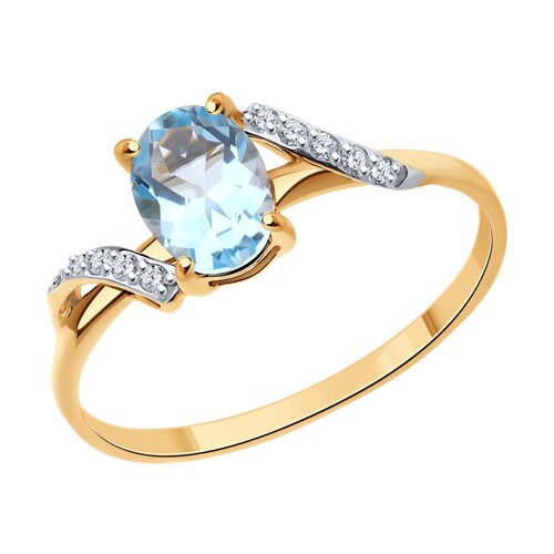 Изящное кольцо с натуральным голубым топазом и сияющими дорожками из фианитов, из красного золота 585 пробы, подчеркнет женственность и привлекательность владелицы. Изумительный нежный топаз красиво переливается на свету, искристые дорожки из фианитов подчеркивают его удивительное сияние. Приобретайте очаровательное украшение в комплекте с серьгами по выгодной цене в магазинах Мир Золота.