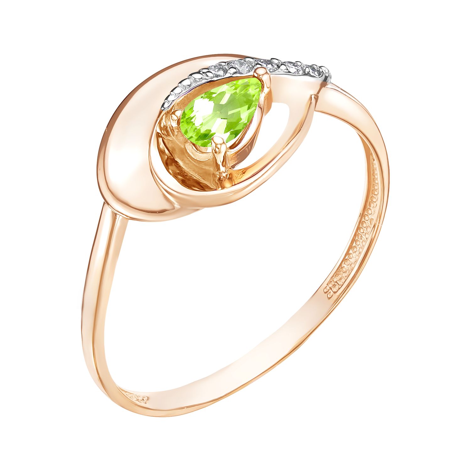 Кольцо с натуральным хризолитом и прозрачными фианитами выполнено из красного золота 585 пробы. Удивительный хризолит нежно-зеленого оттенка окутан мягким блеском драгоценного металла, изящное украшение подчеркнет красоту и женственность владелицы, и станет привлекательной деталью утонченного образа. Приобретайте ювелирное украшение по выгодным ценам в магазинах Мир Золота.
