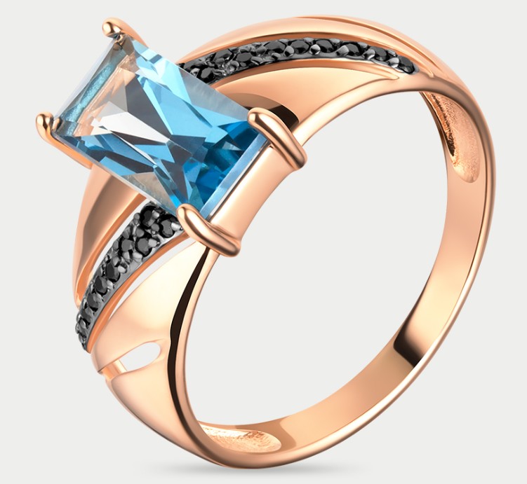 Яркое кольцо выполнено из красного золота 585 пробы с полудрагоценной вставкой с топазом Лондон насыщенного оттенка, дополненным контрастным сиянием дорожек из черных фианитов. Украшение эффектно преобразит любой привычный образ, добавив ему особого шарма и изысканного блеска. Приобретайте ювелирное украшение в подарок по выгодным ценам в магазинах Мир Золота.