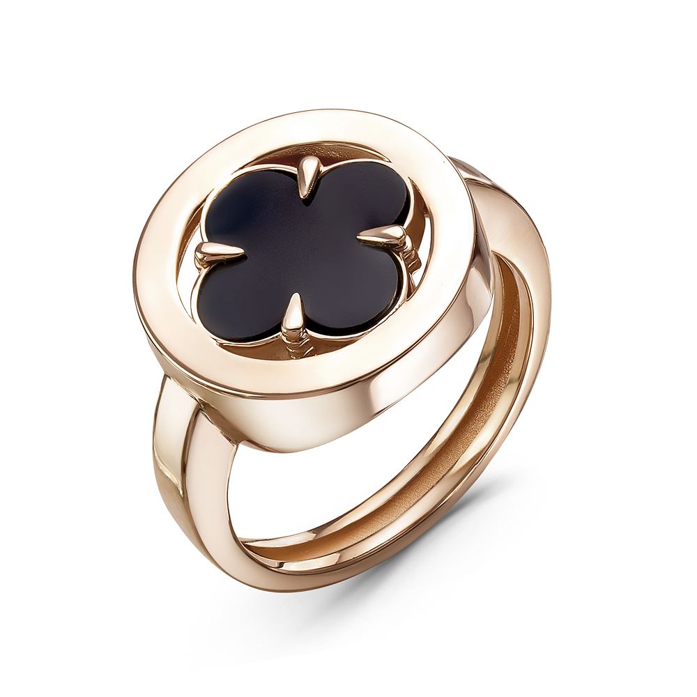 Женское кольцо из красного золота 585 пробы украшено вставкой с черным ониксом в виде четырехлистника. Стильное дизайнерское украшение выглядит элегантно и выразительно, благородный блеск драгоценного металла эффектно дополняет яркое завораживающее сияние черного камня. Приобретайте современное украшение в подарок на удачу, по выгодной цене в магазинах Мир Золота.