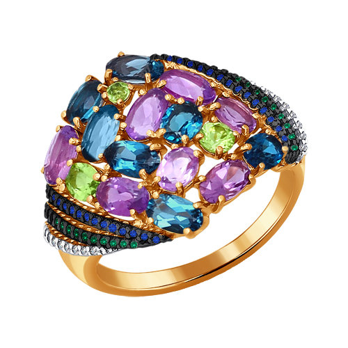 Бесподобное кольцо с россыпью разноцветных камней аметистов, топазов, хризолитов и дорожками из цветных и прозрачных фианитов выполнено из красного золота 585 пробы. Роскошное украшение с завораживающим блеском ювелирных камней позволит создать великолепный и неповторимый образ. Приобретайте ювелирное украшение для себя или в подарок по выгодной цене в магазинах Мир Золота.