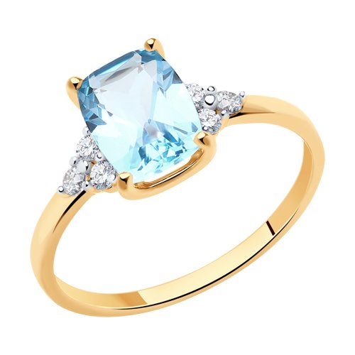 Кольцо привлекательного ювелирного дизайна с эффектным голубым топазом, подчеркнутым сияющими фианитами, выполнено из красного золота 585 пробы. Изящное украшение с чистым блеском лазурного топаза очень красиво и элегантно смотрится на руке, и станет изысканной деталью современного женского образа. Приобретайте кольцо для себя или в подарок, выгодно в магазинах Мир Золота.