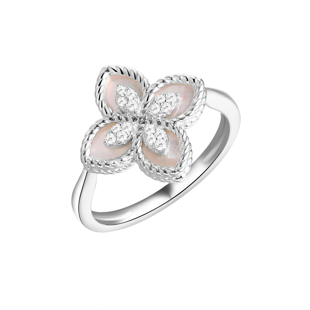 Романтичное серебряное кольцо порадует тех, кто привык быть в центре внимания. Украшение в цветочном дизайне оформлено композицией сверкающих камней круглой огранки в сочетании с нежным перламутром. Кольцо в серебристо-белом оттенке металла станет идеальным завершением любого женского образа: делового, повседневного или вечернего. Приобретайте прекрасное украшение по выгодной цене в магазинах Мир Золота.