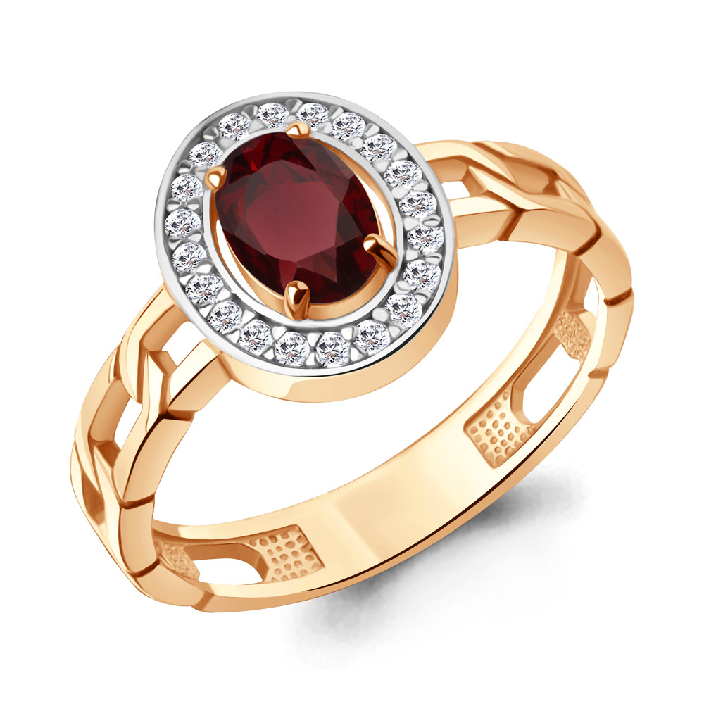 Стильное кольцо современного дизайна из красного золота 558 пробы декорировано яркими овальным гранатом в окружении сияющих фианитов. Кристальный блеск фианитов выгодно подчеркивает природную красоту и насыщенное сияние натурального граната. Украшение станет выразительной деталью выбранного образа и замечательным подарком для современной леди. Приобретайте украшение выгодно в магазинах Мир Золота.