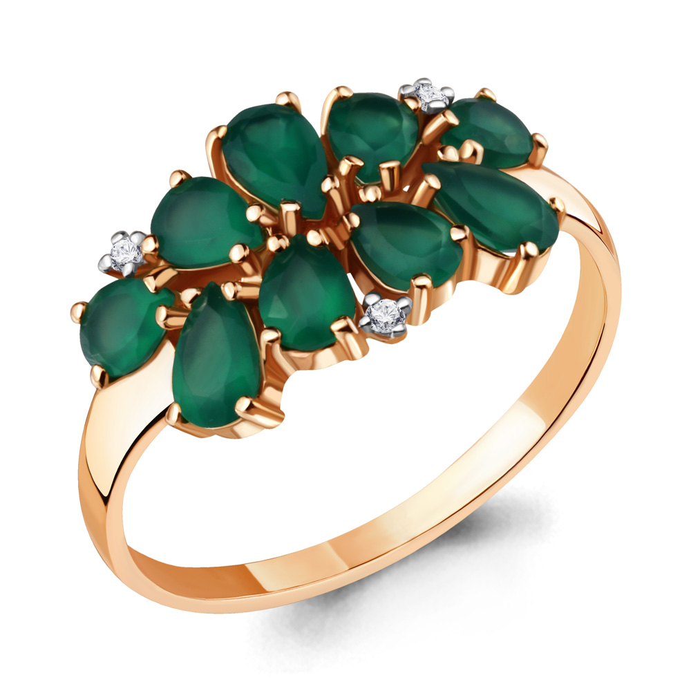Кольцо из красного золота 585 пробы с россыпью зеленых агатов грушевидной формы огранки и миниатюрными фианитами. Яркое украшение с насыщенным блеском природных камней подчеркнет женскую привлекательность и очарование, и изысканно дополнит повседневный или вечерний образ. Приобретайте ювелирное украшение в подарок по выгодным ценам в магазинах Мир Золота.