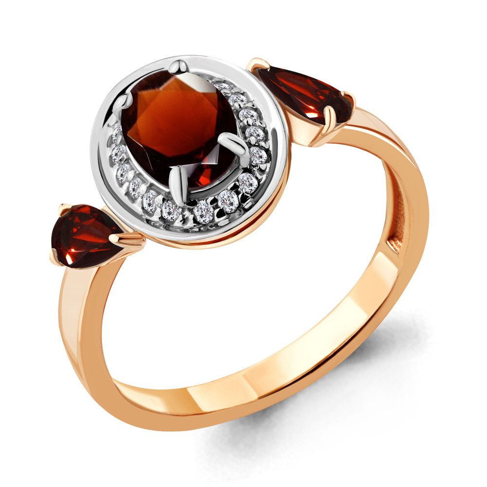 Кольцо из красного золота 585 пробы с натуральными гранатами и прозрачными фианитами станет яркой изюминкой женского образа. Выразительная вставка из белого золота выгодно акцентирует великолепный гранат, кристальные фианиты эффектно подчеркивают насыщенный блеск благородных камней. Дополните свой привлекательный образ изысканным акцентом, покупайте кольцо по выгодной цене в магазинах Мир Золота.