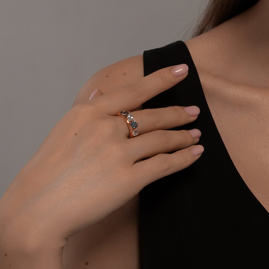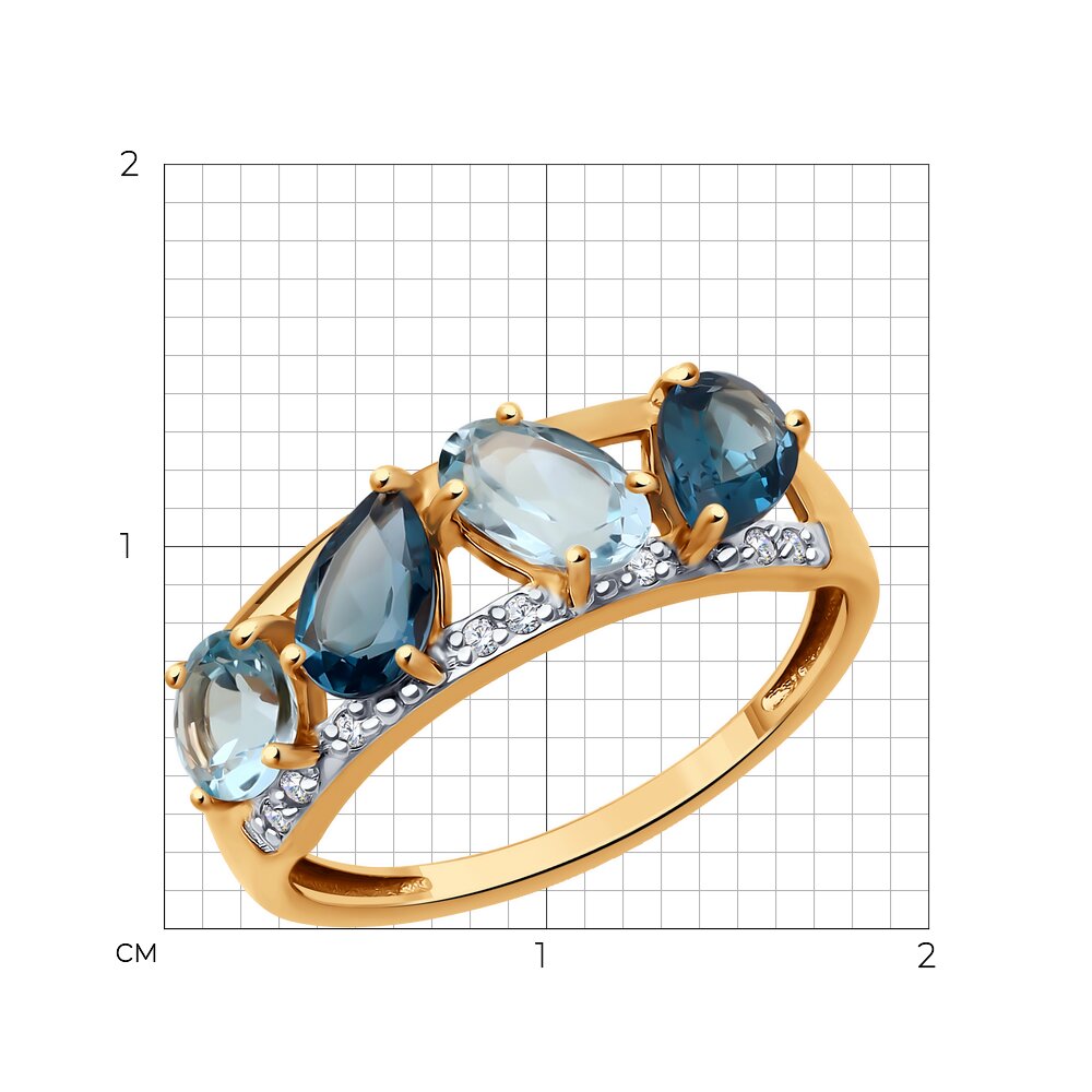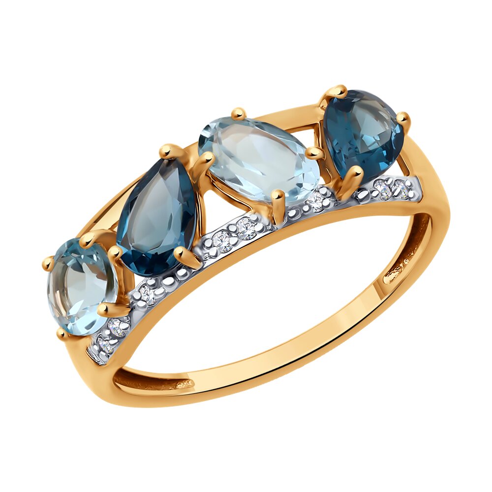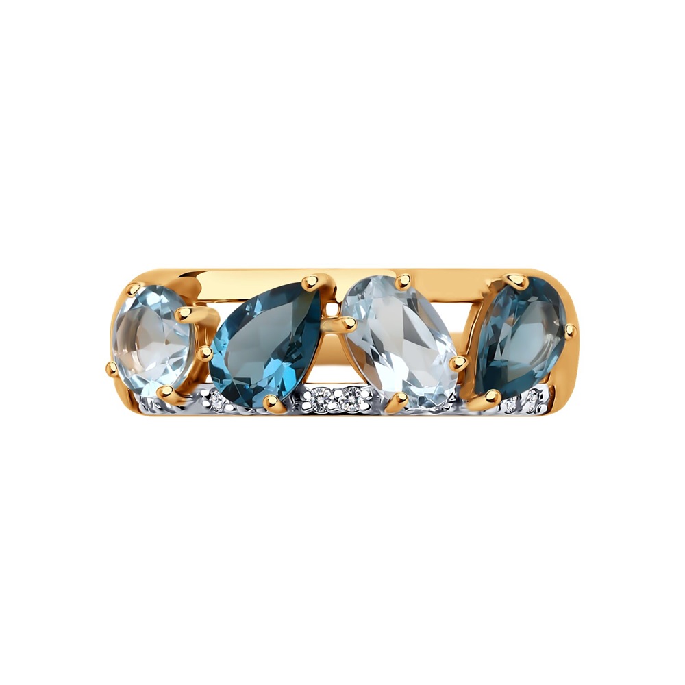 Кольцо из красного золота 585 пробы с миксом голубых топазов и прозрачными фианитами станет идеальным подарком, подчеркивающим красоту и женственность владелицы. Прекрасные топазы различной формы огранки в гармоничном сочетании с мягким блеском золота сделают женский образ более изысканным и притягательным. Покупайте кольцо по выгодной цене в магазинах Мир Золота.