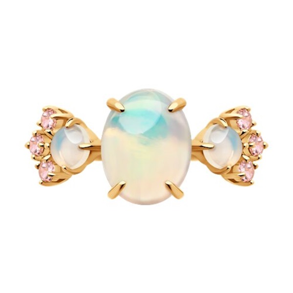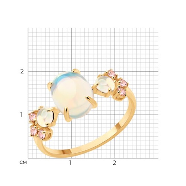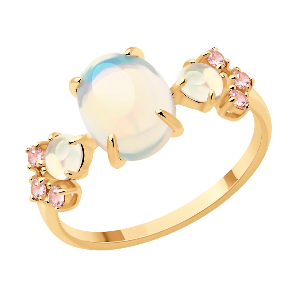 Привлекательное кольцо интересного дизайна из красного золота 558 пробы декорировано натуральными опалами и розовыми фианитами. Очаровательное украшение с нежным переливчатым блеском ювелирных камней добавит образу женственности и неповторимого шарма. Приобретайте кольцо для себя или в подарок по выгодным ценам в магазинах Мир Золота.