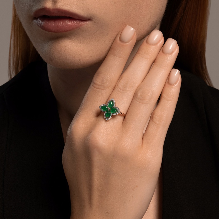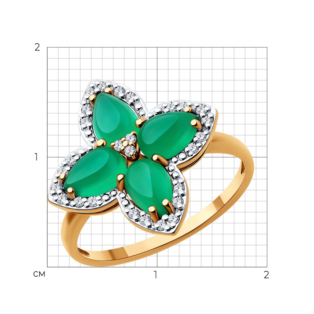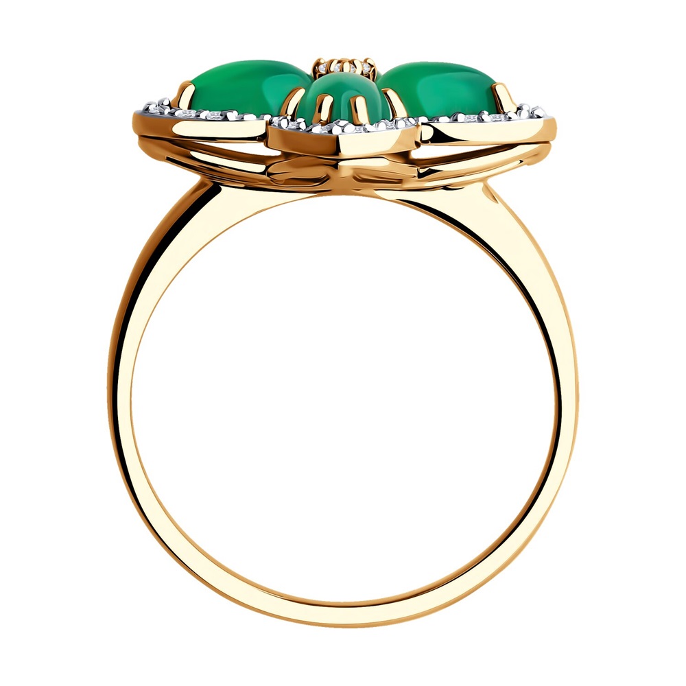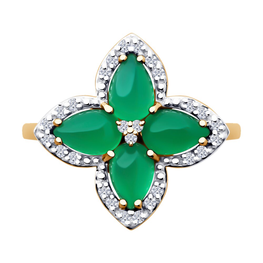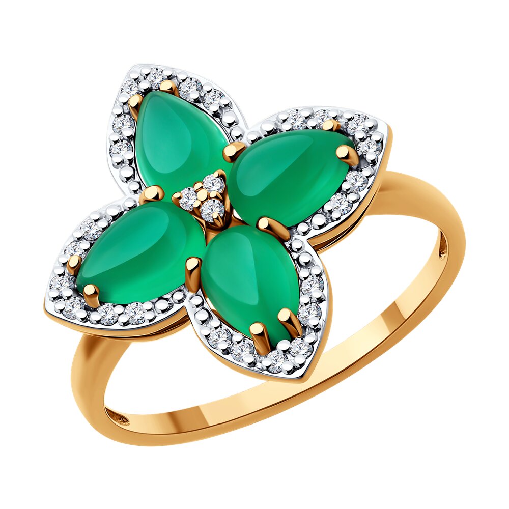 Изысканное кольцо из красного золота 585 пробы с зелеными агатами и прозрачными фианитами выполнено в актуальном флористическом дизайне. Загадочный блеск зеленых агатов эффектной формы огранки в обрамлении сияющих фианитов привлекает внимание. Притягательное украшение придаст образу естественности и природного очарования. Приобретайте акцентное украшение по выгодным ценам в магазинах Мир Золота.