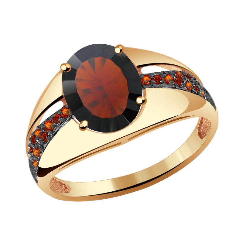 Кольцо из красного золота 585 пробы декорировано великолепным гранатом и дорожками с цветными фианитами. Широкое кольцо с насыщенным сиянием ювелирных камней на фоне драгоценного блеска золота не останется незамеченным, и будет выразительной деталью неповторимого женского образа. Приобретайте украшение в подарок по выгодной цене в магазинах Мир Золота.